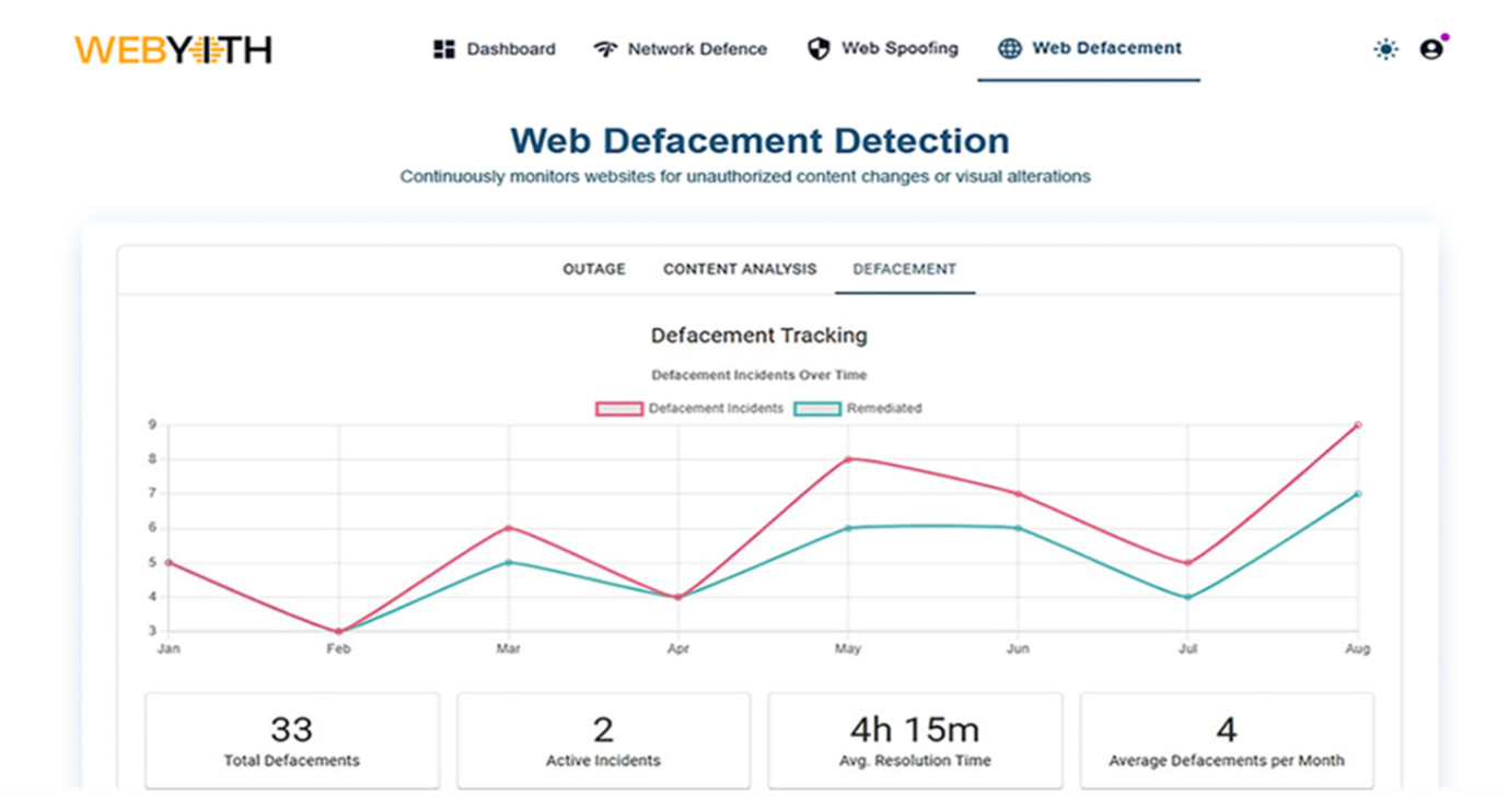 Actively monitors websites to identify unauthorized modifications or defacement in near real time, helping preserve the credibility and security of your online presence.